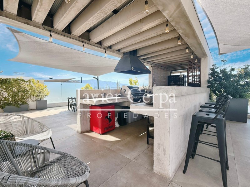 La azotea se entrega tal cual en las fotos: 33 maceteros con plantas formadas ( jardín desarrollado por Ecoroof), quincho equipado, muebles living y comedor + banquetas barra, cava. Velas de azotea fabricadas e instaladas por Arquitex